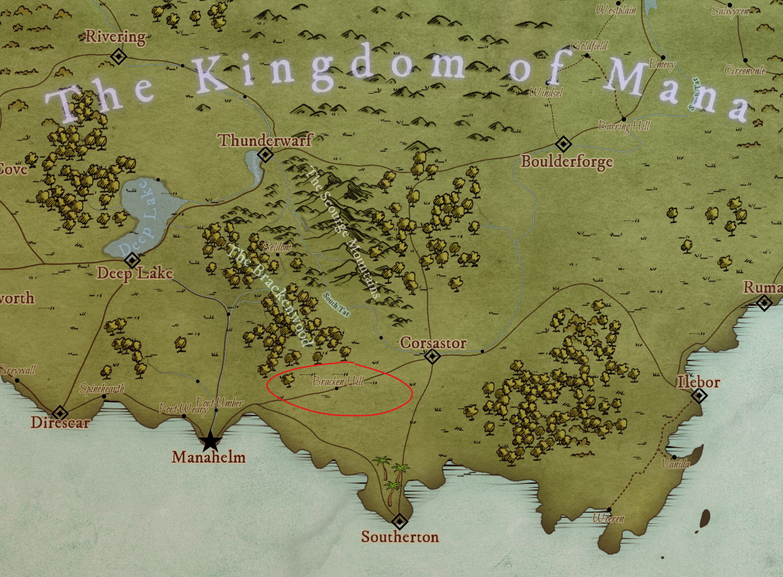 This adventure is set in the town of Bracken hill, between the capital Manahelm and the city of Corsastor. It is an important stopover for those travelling between the two cities. Manahelm is 57 miles (3 days) along the West road, and Corsastor is 42 miles (2 days) along the East Road. It is common to find convoys of a up to two dozen wagons and carts travelling along the road, and they are usually accompanied by dispatched military from Manahelm or Corsastor, but due to recent events, these troops have been deployed elsewhere.