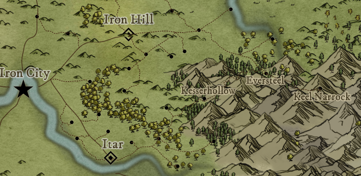 Kesserhollow is a small mining town in the Iron Hills with a population of 400. It sits in a valley with a small river running through, surrounded by lush temperate forest. There are two roads out of town, one headed South-West towards Itar, and the other North-East through the mountains toward Eversteel.